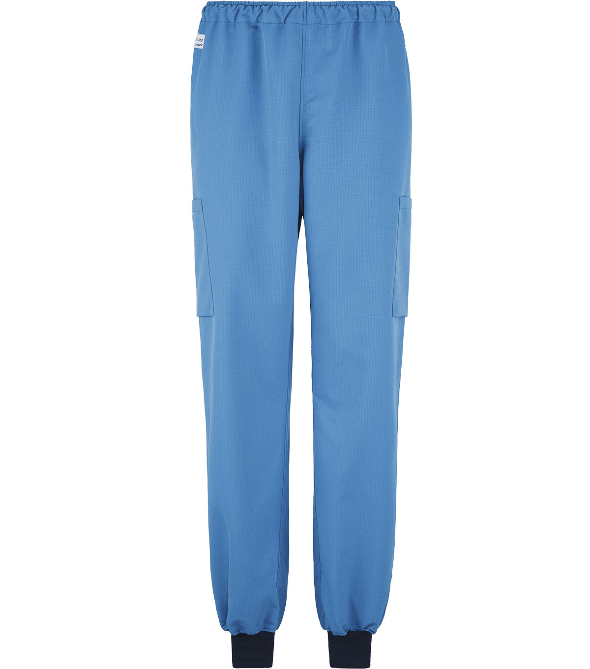 Operationsbyxa i microfiber, resår med snodd i midjan och tätslutande mudd nertill. Byxan har två enkla benfickor.